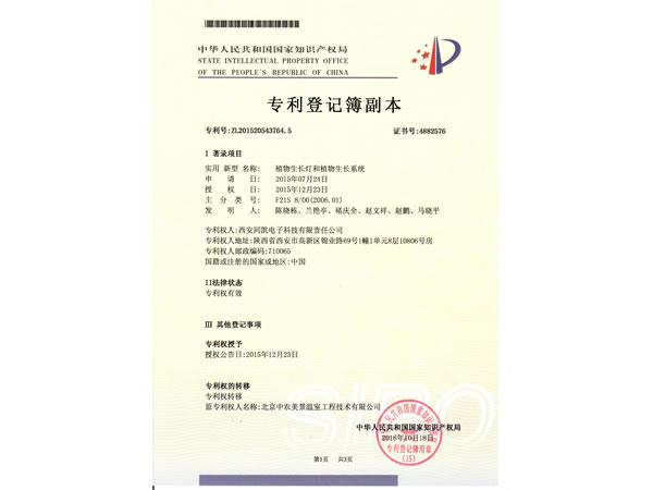 2015年7月24日获得中华人民共和国国家知识产权局颁发的实用新型发明专利证书;